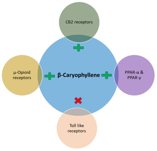 Among the three different isoforms, PPAR-α, mainly expressed in heart, liver, intestine, and macrophages is activated by polyunsaturated fatty acids and leukotrienes. Whereas PPAR-γ, mainly expressed in adipocytes is activated by polyunsaturated fatty acids and 15d-prostaglandin J2 and plays a vital role in adipocyte differentiation and lipid accumulation. Functionally, the PPAR isoforms resembles to those of the steroid receptors and linked to multiple functions initiated by nutrients, nutraceuticals, and phytochemicals. Ligand-binding to CB1R and CB2R enhances the activity of MAPK that further regulates the activation of PPARs through direct phosphorylation and PPAR activation provides a basis by which cannabinoids like BCP can regulate gene transcription triggered by dietary intervention. Several studies provide evidence that cannabinoids exert their anti-inflammatory properties, at least in part by activation of PPAR-α and PPAR-γ pathway [65,66].
