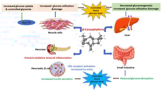 Pancreatic β-cells releases insulin to control the sugar levels in the blood when blood glucose concentration increases. BCP has been shown to influence dysfunctional pancreatic β-cells and insulin secretion. Suijun, et al. [32] have demonstrated the roles of BCP on glucose-stimulated insulin secretion (GSIS) and underlying mechanisms. GSIS is vital for the regulation of metabolic fuel homeostasis and its deregulation, and is a crucial component in the failure of β-cells in T2DM. BCP treatment to MIN6 β-cells dose-dependently enhanced GSIS [32]. However, when MIN6 cells were treated with a CB2R blocker or specific RNA interference abrogated the positive effects of BCP on GSIS that demonstrated CB2R activation-dependent effect of BCP on GSIS and potential in T2DM.