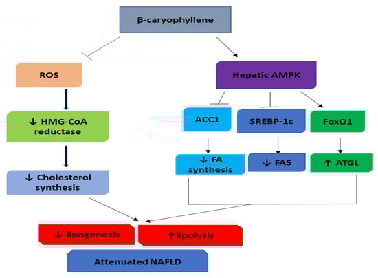 Altogether, these studies indicate that BCP has an antioxidant activity leading to the reduction of ROS, therefore, may be associated with deactivation of HMG-CoA reductase and decreased cholesterol synthesis, leading to hypolipidemia are represented in Figure 4. Also, BCP activated AMPK signaling via the mediation of the CB2R-dependent Ca2+ signaling pathway leading to the downregulation of FAS and upregulation of ATGL. Additionally, BCP could be a promising therapeutic drug in treating hypercholesterolemia and fatty liver disease.