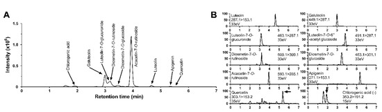 The total ion chromatogram (A) and selected reaction monitoring chromatogram (B) of individual flavonoids from Chrysanthemum morifolium Ramat leaf extracts (CLE).