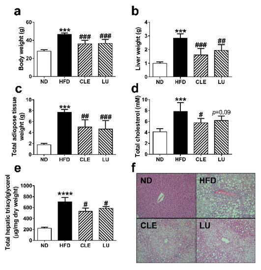 Effect of Chrysanthemum morifolium Ramat leaf extracts (CLE; 1.5%) and luteolin (LU; 0.003%) on body weight (a), liver weight (b), total adipose tissue weight (c), total cholesterol level (d), total hepatic triacylglycerol contents (e), and hepatic morphology (original magnification × 100) (f) in C57BL/6J mice fed a high-fat diet (HFD). The data are shown as mean ± standard deviation (SD) (n = 6). *, # different letters indicate significant difference compared with normal diet (ND) group (*) and HFD group (#), as determined by Tukey’s multiple comparisons test. (*** p < 0.001, **** p < 0.0001, # p < 0.05, ## p < 0.01, ### p < 0.001).