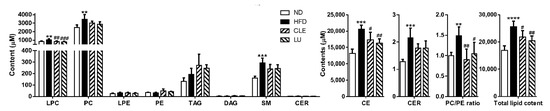 Overview of the effects of Chrysanthemum morifolium Ramat leaf extracts and luteolin on the serum lipidome in obese mice. The total lipid contents are expressed as the sum of contents of all identified lipids in mice plasma. Lipid classes are indicated on the x-axis: LPC, lysophosphatidylcholine; PC, phosphatidylcholine; LPE, lysophosphatidylethanolamine; PE, phosphatidylethanolamine; TAG, triacylglycerol; DAG, diacylglycerol; SM, sphingomyelin; CER, ceramide; CE, cholesteryl ester. The data are shown as mean ± standard deviation (SD) (n = 6). *, # different letters indicate significant difference compared with the normal diet (ND) group (*) and high-fat diet (HFD) group (#), as determined by Tukey’s multiple comparisons test. CLE: HFD plus Chrysanthemum morifolium Ramat leaf extract 1.5% diet; LU: HFD plus luteolin 0.003% diet (** p < 0.01, *** p < 0.001, **** p < 0.0001, # p < 0.05, ## p < 0.01, ### p < 0.001).