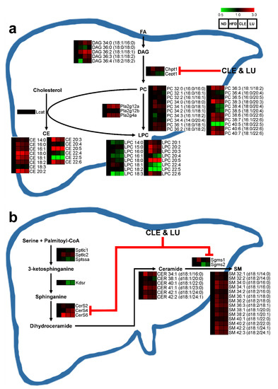 Scheme of the phospholipid synthesis (a) and sphingolipid synthesis (b) by which Chrysanthemum morifolium Ramat leaf extracts and luteolin regulates serum lipids and related hepatic gene-expression. The features of these compared to the ND group are color-coded by row, with red indicating high levels and green indicating low levels. ND: normal diet; HFD: high-fat diet; CLE: HFD plus Chrysanthemum morifolium Ramat leaf extract 1.5% diet; LU: HFD plus luteolin 0.003% diet; FA: fatty acid; DAG: diacylglycerol; PC: phosphatidylcholine; LPC: lysophosphatidylcholine; CE: cholesteryl ester; CER: ceramide; SM: sphingomyelin.