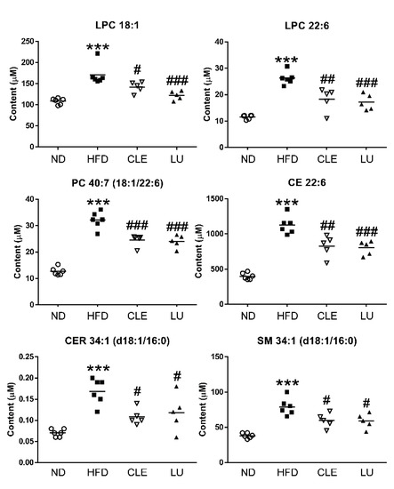 Scatter plot showing significant differences in the levels of the lipid biomarkers with the same lipid compositions among the normal diet (ND), high-fat diet (HFD), HFD plus Chrysanthemum morifolium Ramat leaf extract 1.5% diet (HFD + CLE), and HFD plus luteolin 0.003% diet (HFD + LU) groups. Each symbol represents an individual mouse (Circle (○): ND; Box (■): HFD; Inverted triangle (▽): CLE; Triangle (▲): LU; Diamond (◆): Quality control (QC)). *, # different letters indicate significant difference compared with the normal diet (ND) group (*) and the HFD group (#), as determined by Tukey’s multiple comparisons test. (*** p < 0.001, # p < 0.05, ## p < 0.01, ### p < 0.001). LPC: lysophosphatidylcholine; PC: phosphatidylcholine; CE: cholesteryl ester; CER: ceramide; SM: sphingomyelin.