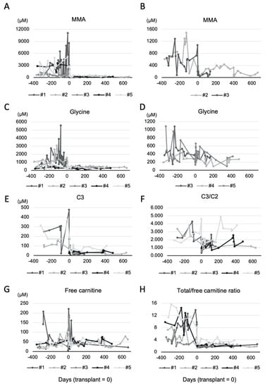 Biochemical profiles of patients six months before and after liver transplant. (A,B); plasma MMA level, (C,D); plasma glycine level, (E); plasma C3 level, (F); plasma C3/C2 ratio, (G); plasma free carnitine level, (H); plasma total/free carnitine ratio. (B,D) graphs represent values of patients who had lower MMA or glycine levels compared to the other patients, respectively. 0 of x-axis represents the day of transplant. Numbers of x-axis represent patients’ ID. MMA; methylmalonic acid, C3; propionyl-carnitine, C2; acetyl-carnitine.