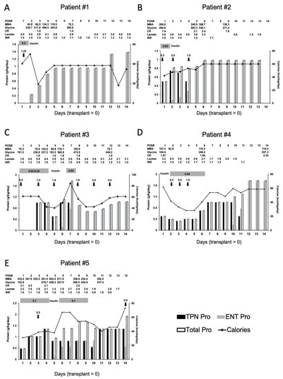 Nutritional management 2 weeks after liver transplant of (A) Patient #1, (B) Patient #2, (C) Patient #3, (D) Patient #4, and (E) Patient #5. Daily protein (vertical bars) and calorie (black line) intakes are shown. Black vertical bars: protein intake from total parenteral nutrition (TPN) (g/kg/day); grey vertical bars; protein intake from enteral feeding (ENT) (g/kg/day); white vertical bars: total protein intake (Total) (g/kg/day); black arrows: albumin infusion with dose (g/kg/dose); grey horizontal bars: insulin infusion with dose (units/kg/h). Normal ranges and units; plasma MMA = 0–0.4 μM, glycine = 127–341 μM, lactate = 0.5–2.2 mM. MMA; methylmalonic acid, CR; plasma total/free carnitine ratio.