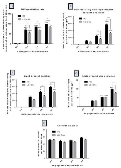 Micrographs of 3T3-L1 cells differentiated in either LG-GAL or HG in T75 flasks were taken all along the differentiation process on D0, D3, D5, and D7. Images were acquired on a Nikon Eclipse i20 microscope.