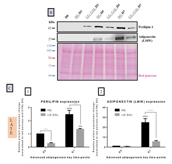 Carbohydrates Intake Impacts the Early Adipogenesis Phase and Consequently Performances of Mature Adipocytes (A): Early and late adipogenic markers gene expression in 3T3-L1 cells at differentiation (D0) and day 3 (D3), D5, and D7 of adipogenesis in HG vs. LG-GAL conditions. mRNA levels are relative fold changes normalized by 18 s mRNA levels and by gene of interest expression levels at D0. 1. Peroxisome proliferator-activated receptor gamma (PPAR-γ), 2. Preadipocyte factor 1 (PREF-1), 3. Perilipin-1 (PLIN1), 4. Fatty acid synthase (FASN), 5. Adiponectin (ADIPOQ); Results are the means SEM (biological (n = 3) and technical (n = 3) triplicates). Statistical (n.s, * p < 0.05; ** p < 0.01; *** p < 0.001; **** p < 0.0001) comparison of each time points to D0 (in black) and between HG vs. LG-GAL (in gray) were performed by two-way ANOVA and Holm–Sidak’s multiple-comparison test; (B): Representative immunoblot of adipogenic proteins expressed in 3T3-L1 cells during the adipogenesis maturation phase; (C): Protein expression of mature adipocyte markers in 3T3-L1 cells at D0 and D3, D5, and D7 of adipogenesis in HG vs. LG-GAL conditions. Data are densitometric analysis normalized by Red Ponceau densitometric values and by protein expression levels at D5 in the HG condition. 1. Perilipin-1 protein expression; 2. Low molecular weight (LMW) adiponectin protein expression. Results are the means SEM (biological (n = 3) and technical (n = 3) triplicates). Statistical (n.s, * p < 0.05; ** p < 0.01; *** p < 0.001; **** p < 0.0001) comparison of each time points to the D5 situation (in black) and between HG vs. LG-GAL (in gray) were performed by two-way ANOVA and Holm–Sidak’s multiple-comparison test.