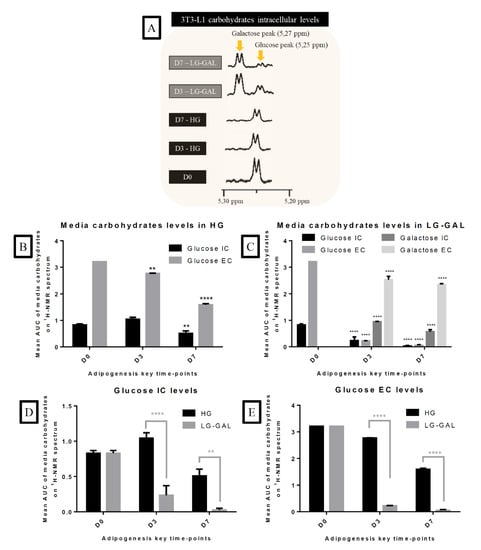 In order to evaluate carbohydrates management and intake in differentiating and maturating 3T3-L1 adipocytes in HG vs. LG-GAL conditions, carbohydrates levels were assessed in intracellular (IC) and extracellular (EC) compartments. An enlarged view of glucose/galactose peaks in 1H NMR spectra of 3T3-L1 intracellular media indicates the intake of both glucose and galactose in the LG-GAL condition and high IC glucose levels in the HG condition (Figure 3A). Semi-quantitative assessment based on the integration of the area under the curve (AUC) of glucose or galactose peaks also revealed different carbohydrates supply management depending on the condition. In the HG condition, extracellular glucose levels significantly decreased all along the differentiation without reaching a zero level (Figure 3B). Similar IC and EC glucose levels evolution in 3T3-L1 are observed in the LG-GAL condition (Figure 3B,C) with a significant decrease of intracellular glucose levels on D7 occurring in both conditions. In the LG-GAL condition, galactose resources are also correlated to prevalent and increasing intake over the differentiation process as evidenced by galactose IC level increase and extracellular decrease. To evaluate if galactose intake was linked to insufficient glucose extracellular availability over the adipogenic process, both IC and EC glucose levels in both conditions were compared (Figure 3D,E). Although both IC and EC glucose levels were significantly lower in the LG-GAL condition, levels never reached an undetectable threshold.