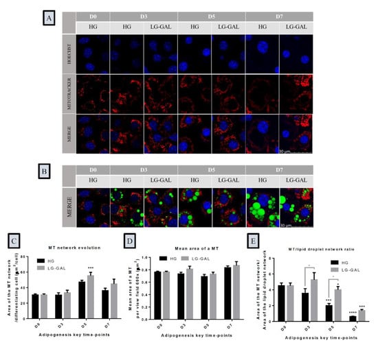 The Mitochondrial Network Evolution Depends on Carbohydrates Supplies and on the Lipid Droplet Network Evolution during Adipogenesis (A): Representative fluorescent micrographs of the mitochondrial (MT) network of 3T3-L1 cells at D0 and D3, D5, and D7 of adipogenesis in HG vs. LG-GAL conditions. Hoechst staining evidences nuclei in blue, MitoTracker™ Red CMXRos staining evidences the mitochondrial network in red; (B): Lipid droplets (BODIPY, green) and mitochondrial (MitoTracker™ Red CMXRos) network co-detection on representative fluorescent micrographs of 3T3-L1 cells in HG vs. LG-GAL conditions; (C): Mitochondrial (MT) network area per differentiating 3T3-L1 cell per field (600×) in HG vs. LG-GAL conditions; (D): Mean mitochondrion (MT) area at D0 and D3, D5, and D7 of adipogenesis in HG vs. LG-GAL conditions. (E): Mean mitochondrion (MT) to lipid droplet network area ratio at D0 and D3, D5, and D7 of adipogenesis in HG vs. LG-GAL conditions. Figure C–E are the means ± SEM for n = 15 view fields (600×). Statistical (n.s, * p < 0.05; *** p < 0.001; **** p < 0.0001) comparison of each time points to the D0 situation (in black) and between HG vs. LG-GAL (in gray) were performed by two-way ANOVA and Holm–Sidak’s multiple-comparison test.