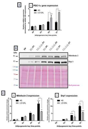 Both Mitochondrial Biogenesis and Dynamics Phenomena are Sensitive to Adipogenesis Triggering and are Impacted by Carbohydrates Supplies (A): Peroxisome proliferator-activated receptor gamma coactivator 1-alpha (PGC1-α) gene expression in 3T3-L1 cells at the several time points of adipogenesis in HG vs. LG-GAL conditions. mRNA levels are relative fold changes normalized by 18 s mRNA levels and by gene of interest expression levels at D0; (B): Representative immunoblot of mitochondrial dynamics and biogenesis-related factor proteins expressed in 3T3-L1 cells during the adipogenesis maturation phase and Red Ponceau; (C): Mitochondrial dynamics and biogenesis-related factor protein expression in 3T3-L1 cells in HG vs. LG-GAL conditions. Data are densitometric analysis normalized by Red Ponceau densitometric values and by protein expression levels at D3 in the HG condition. 1. Mitofusin 2 (Mfn2) as a marker of mitochondrial fusion phenomena; 2. Dynamin-1-like protein (Drp1) as a marker of mitochondrial fission phenomena. Results are the means SEM (biological (n = 3) and technical (n = 3) triplicates). Statistical (n.s, * p < 0.05; ** p < 0.01; **** p < 0.0001) comparison of each key time points to the D5 situation (in black) and between HG vs. LG-GAL (in gray) were performed by two-way ANOVA and Holm–Sidak’s multiple-comparison test.
