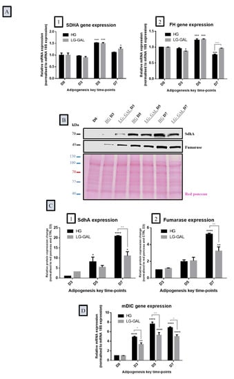 Finally, genes and proteins acting in cell respiration as well as mitochondrial transport systems were evaluated in both HG and LG-GAL conditions during adipogenesis. The gene expression of the succinate dehydrogenase subunit A (SDHA), a marker of both Krebs cycle and mitochondrial respiration [], was significantly increased on D5 without noticeable differences between HG and LG-GAL conditions (Figure 6A1). Similarly, the fumarase (FH) enzyme was transcriptionally expressed during late adipogenic phases, reaching a peak of expression by D5 in both conditions. At the proteic level, both SdhA and fumarase expressions sharply increased over the adipogenic process, reaching significant increased levels on D7 in differentiating 3T3-L1 (Figure 6C1,C2). Those observations are correlated to gene expression induction on D5, subsequently leading to protein expression increase on D7. Regarding the mitochondrial transport, the gene expression of the mitochondrial dicarboxylate carrier protein (mDIC) displayed a significant increase during the adipogenesis, yet it was significantly lower in the LG-GAL condition as compared to the HG one on D3, D5, and D7 (Figure 6D).