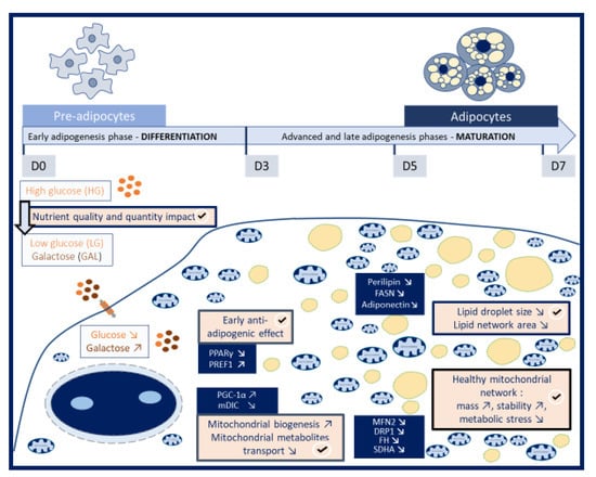 The glucose lowering and replacement by galactose (LG-GAL) strategy during the adipogenic process (7 days) at the differentiation and maturation phases. The differentiation of 3T3-L1 preadipocytes into adipocytes in a standard high-glucose (HG) condition (25 mM) compared to a situation of LG-GAL (5 mM glucose + 20 mM galactose) aims at evaluating the impact of both nutrient quality and quantity to modulate the adipogenic process. Exposing differentiating 3T3-L1 cells to the LG-GAL condition compared to the HG condition leads to decreased intracellular levels of glucose and an important intake of galactose independently on energetical production requirement. Simultaneous carbohydrates intracellular levels and quality modifications do influence adipogenesis at its early phase, as displayed by an anti-adipogenic effect witnessed by early adipogenic marker expression modulation (decreased expression of PPARγ and increased expression of PREF-1). The LG-GAL condition does also impact the early adipogenic phase through influencing the mitochondrial network, as evidenced by an increase in PGC-1α reflecting respectively increased mitochondrial biogenesis. Those major remodeling events occurring during the early adipogenic phase further influence mature adipocyte features acquirement and mitochondrial network evolution during the maturation phase. The early anti-adipogenic effect of LG-GAL is further linked to a reduction of expression of three main markers of mature adipocytes (PLIN1, FASN, and the adiponectin) correlated to a significant reduction of the lipid droplets size and network area during the maturation phase. The glucose lowering and replacement by galactose (LG-GAL) strategy leads to an improvement of the overall mitochondrial health status with an increase of the mitochondrial mass, an increased mitochondrial network stability, and a reduction of the mitochondrial metabolic stress. Through this combination of an anti-adipogenic effect with an overall improved mitochondrial health status, our glucose lowering and replacement by galactose strategy displays promising clues in regard to the research of obesity-controlling strategies.