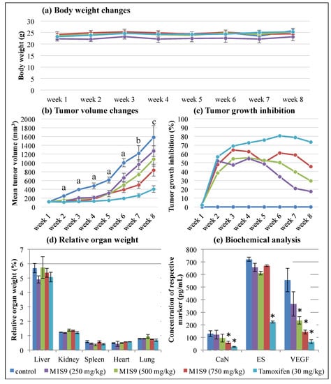 The effects of M1S9 extracts on breast tumor growth using MDA-MB-231 xenograft animal model: (a) body weight changes (g); (b) tumor volume changes (mm3); (c) tumor growth inhibition (%); (d) relative organ weight (%); (e) biochemical analysis (pg/mL) over eight weeks after treatments with three doses of M1S9 extracts, normal saline (negative control) and tamoxifen 30 mg/kg (positive control). Values are in mean ± S.E.M. In tumor volume changes, a, b and c indicate significant differences (p < 0.05) with the control at the same week as determined by Dunnett test, a non-parametric test. “a” was significant difference in all treatment groups, “b” was significant difference in all treatment groups except low dose M1S9 (250 mg/kg) and “c” was significant difference in all treatment groups except low dose M1S9 (250 mg/kg) and medium dose M1S9 (500 mg/kg). In biochemical analysis, asterisk (*) means significant difference from control group (p < 0.05). Abbreviations: CaN—calcineurin; ES—estrogen; VEGF—vascular endothelial cell growth factor.