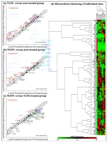 Effect of M1S9 on the expression levels of 84 key human breast cancer genes in MDA-MB-231 xenograft tumor: (a) TAM-treated versus non-treated group; (b) M1S9-treated versus non-treated group; (c) M1S9-treated versus TAM-treated group; (d) hierarchical clustering of individual mice. Upregulated genes (red characters) and downregulated genes (green characters) have fold changes ≥ ±2. Blue bracket indicates genes with significant difference at p < 0.05. Abbreviation: TAM—tamoxifen.