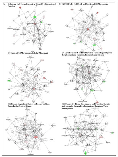 Top three enriched networks in (a) TAM-treated; (b) M1S9-treated MDA-MB-231 xenograft tumor. Up/downregulated genes (fold changes ≥ ±2) are colored in red and green, respectively, while the color intensities are relative to fold change. Nodes without color were neither expressed nor assessed in this study. Abbreviation: TAM—tamoxifen.
