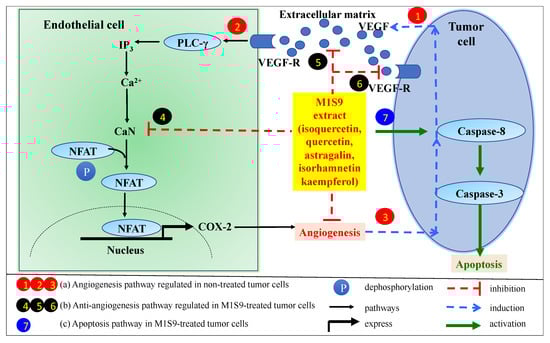 Possible pathways involved in tumorigenesis, angiogenesis and cell apoptosis. (a) Angiogenesis pathway in non-treated tumor cells. (1) Tumor cells secrete VEGF into the extracellular matrix and then bind to VEGFR on endothelial cells to activate the NFAT signaling cascade for VEGF-induced angiogenesis. (2) VEGFR pathway activates phospholipase Cγ (PLCγ) and releases calcium via inositol-1,4,5-triphosphate (IP3) to activate calcineurin (CaN) activity via calmodulin (a calcium-binding protein). Activated CaN regulates NFAT dephosphorylation to enter into nucleus to regulate cyclooxygenase-2 (COX-2) gene expression that can stimulate angiogenesis process. (3) VEGF-mediated angiogenesis induces more VEGF secretion for blood vessel formation. (b) Anti-angiogenesis pathway in M1S9-treated tumor cells. (4) M1S9 extract might inhibit CaN activity without inducing NFAT pathway. As a consequence, it will limit (5) VEGF release from tumor cell and limit (6) the dimer formation of VEGF to VEGF-R. (c) Apoptosis pathway in M1S9-treated tumor cells. (7) M1S9 extract activates caspase-8 in tumor cell that govern the apoptosis pathway (adapted and modified from Zhao et al., 2016).