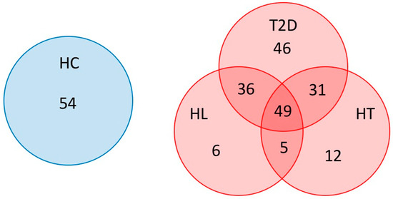 Subjects enrolled in this study. Patients overlapping T2D, HT, and HL were indicated using a Venn diagram. (HC: healthy controls, T2D: type 2 diabetes, HT: hypertension, HL: hyperlipidemia).