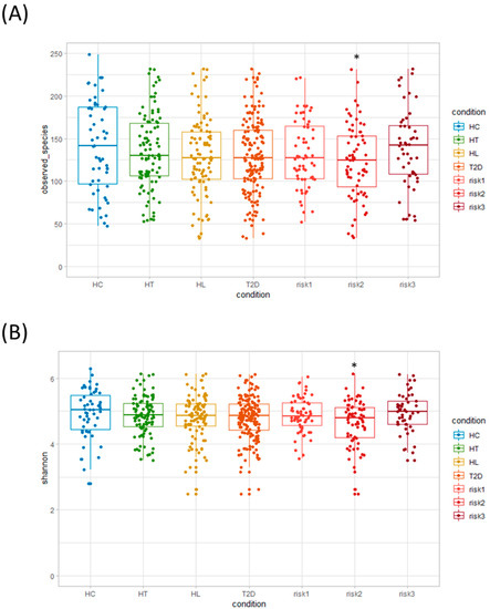 Analysis of α-diversity in gut microbiota. We evaluated and compared α-diversity indices: (A) observed species (operational taxonomic unit (OTU) richness estimation) and (B) Shannon index (OTU evenness estimation), using Student’s unpaired t-tests (* p < 0.05 vs. HC). (HC: healthy controls, HT: hypertension, HL: hyperlipidemia, T2D: type 2 diabetes, RISK1: patients with only one disease among HT, HL, and T2D, RISK2: patients with two diseases among HT, HL, and T2D, RISK3: patients with the three diseases (HT, HL, and T2D)).