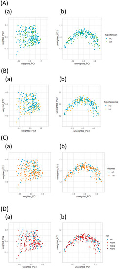 Principal coordinate analysis plots of gut microbiota. Distances were calculated with unweighted (a) and weighted (b) UniFrac for HT (A), HL (B), T2D (C), and RISK1, 2, and 3 (D) compared to HC. (HC: healthy controls, HT: hypertension, HL: hyperlipidemia, T2D: type 2 diabetes, RISK1: patients with only one disease among HT, HL, and T2D, RISK2: patients with two diseases among HT, HL, and T2D, RISK3: patients with the three diseases (HT, HL, and T2D)).