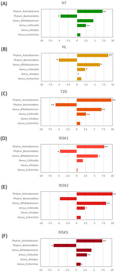 Relative abundance of gut microbiota at the genus level. The genera with significant differences among each group compared to HC are presented for HT (A), HL (B), T2D (C), RISK1 (D), RISK2 (E), and RISK3 (F), using Student’s unpaired t-tests (* p < 0.05, ** p < 0.01 vs. HC). (HC: healthy controls, HT: hypertension, HL: hyperlipidemia, T2D: type 2 diabetes, RISK1: patients with only one disease among HT, HL, and T2D, RISK2: patients with two diseases among HT, HL, and T2D, RISK3: patients with the three diseases (HT, HL, and T2D)).