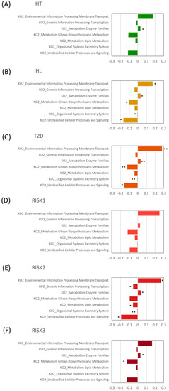 Relative abundance of functional pathways. The KEGG (Kyoto Encyclopedia of Genes and Genomes) database functional categories at the second level of KEGG and metabolic enzyme families are shown in the histograms for HT (A), HL (B), T2D (C), RISK1 (D), RISK2 (E), and RISK3 (F) compared to HC, using Student’s unpaired t-tests (* p < 0.05, ** p < 0.01 vs. HC). (HC: healthy controls, HT: hypertension, HL: hyperlipidemia, T2D: type 2 diabetes, RISK1: patients with only one disease among HT, HL, and T2D, RISK2: patients with two diseases among HT, HL, and T2D, RISK3: patients with the three diseases (HT, HL, and T2D)).