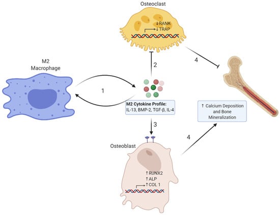 Schematic Diagram Showing the Relationship Between M2 Cytokine Profiles, Macrophage Phenotypes, and Osteoblast and Osteoclast Activity. 1. M2 cytokines, which include interleukin-13 (IL-13), bone morphogenetic protein 2 (BMP2), transforming growth factor beta (TGF-β), and interleukin-4 (IL-4), amongst others, participate in part of a feedback loop; They stimulate M2 macrophage polarization, which upregulates the production of M2 cytokines. 2. M2 cytokine signaling on osteoclasts through their respective receptors downregulates osteoclastic genes, including receptor activator of nuclear factor kappa-Β ligand (RANK) and tartrate resistant alkaline phosphatase (TRAP), which inhibits osteoclast differentiation and activation. 3. M2 cytokine signaling on osteoblasts through their respective receptors upregulates osteogenic genes including Runt-related transcription factor 2 (RUNX2), alkaline phosphatase (ALP), and type 1 collagen (COL 1), which increases osteoblast differentiation and activity. 4. The collective effects of M2 cytokines on different cell types may lead to increased calcium deposition and bone mineralization.