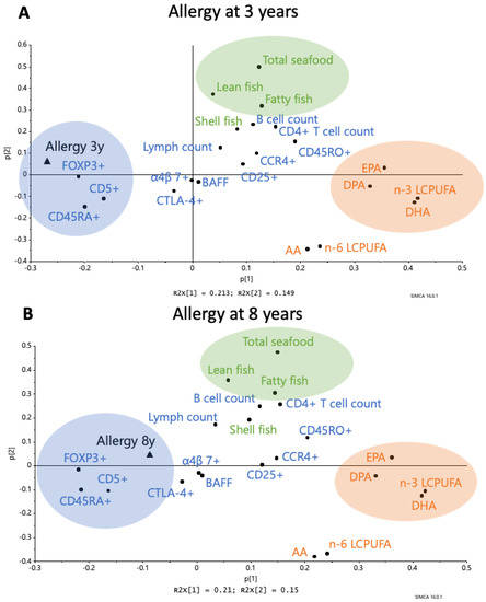 Principal Component Analysis (PCA) loading plot showing the associations between maternal fish intake during pregnancy, LCPUFAs (EPA, DHA, total n-3 LCPUFAs, AA, and total n-6 LCPUFAs) in the cord serum, circulating B cells (B cell count, CD5+) and CD4+ T cells (CD4+ T cell count, activated CCR4+, activated CD25+, memory CD45RO+, naïve CD45RA+, naïve α4β7+, CTLA4+CD25+, FOXP3+CD25high) in umbilical cord blood, and B cell activating factor (BAFF) in the cord plasma and allergy at 3 years of age (A) and 8 years of age (B). Abbreviations: 3y, 3 years; 8y, 8 years, AA, arachidonic acid, EPA, eicosapentaenoic acid; DPA, docosapentaenoic acid; DHA, docosahexaenoic acid; LCPUFA, long-chain polyunsaturated fatty acids. All 65 infants in the FARMFLORA cohort were included in the models.