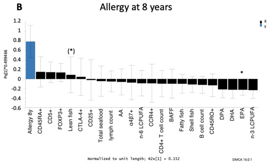 Orthogonal projection to latent structures (OPLS) loading column plot showing the associations between allergy at 3 years of age (A) and 8 years of age (B) and maternal fish intake during pregnancy, LCPUFAs (% of total fatty acids), levels of B cell activating factor (BAFF) in cord serum, and circulating B cells (B cell count/mL and immature CD5+) and CD4+ T cells (CD4+ T cell count/mL, CCR4+, CD25+, memory CD45RO+, naïve CD45RA+, naïve α4β7+, CTLA4+CD25+, FOXP3+CD25high) in cord blood. Only those infants with an allergy diagnosis at 3 or 8 years of age were included in the models. Children who were diagnosed with an allergic disease at an earlier age but were healthy at 3 or 8 years of age (transient allergy) were excluded. Thus, 55 infants were included in the OPLS model for allergy at 3 years of age and 44 infants were included in the OPLS model for allergy at 8 years of age. Associations that were significant in univariate analyses (Mann–Whitney U-test) are indicated with an asterisk: (*) p < 0.1, * p < 0.05. Abbreviations: 3y, 3 years; 8y, 8 years; AA, arachidonic acid; BAFF, B cell activating factor; EPA, eicosapentaenoic acid; DPA, docosapentaenoic acid; DHA, docosahexaenoic acid; LCPUFA, long-chain polyunsaturated fatty acids.