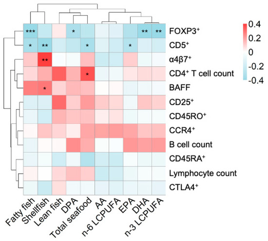 Heatmap showing the correlations between reported maternal seafood intake during pregnancy, fatty acids in cord serum, and immune cells in the cord blood. The magnitude of each correlation is indicated with a color, whereby the red color indicates a positive correlation and the blue color represents a negative correlation. A darker shade of each color indicates a stronger correlation. Levels of statistical significance using Spearman correlations are denoted as: * p < 0.05, ** p < 0.01, *** p < 0.001. Abbreviations: AA, arachidonic acid; EPA, eicosapentaenoic acid; DPA, docosapentaenoic acid; DHA, docosahexaenoic acid; LCPUFA, long-chain polyunsaturated fatty acid; CD25, percentage of CD25+ cells in CD4+ T-cell population; CCR4, percentage of CCR4 cells in CD4+ T-cell population; a4b7, percentage of α4β7+ cell in the of CD4+ T-cell population; CD45RO, percentage of memory CD45RO+ cells in the CD4+ T-cell population; FOXP3, percentage of FOXP3+CD25high cells in the CD4+ T-cell population; CD45RA, percentage of naive CD45RA+ cells in the CD4+ T-cell population; CTLA4, percentage of CTLA-4+CD25+ cells in the CD4+ T-cell population; BAFF, levels of B cell activating factor.