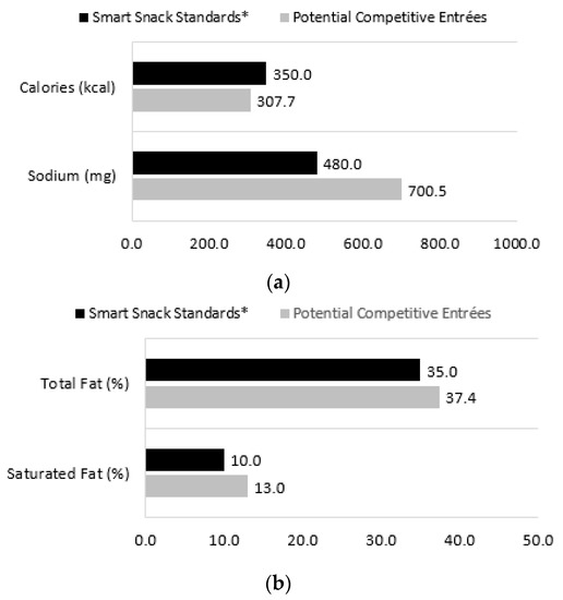Average nutritional characteristics of potential competitive entrées compared with Smart Snacks limits. (a) Average nutritional characteristics of potential competitive entrées compared with Smart Snacks limits: Calories and Sodium; (b) Average nutritional characteristics of potential competitive entrées compared with Smart Snacks limits: Total Fat and Saturated Fat. Data on potential competitive entrées are school-level and take account of the survey design. School-level mean nutritional characteristics were computed across all potential competitive entrée items prepared in the given target week. Means were computed across schools. n = 1108 schools from the 2014–2015 School Nutrition and Meal Cost Study (SNMCS). * Values for Smart Snacks represent the maximum limit for nutrients.