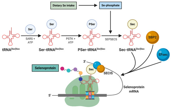 Selenoproteins contain the 21st amino acid (Sec) which is inserted during protein synthesis. Selenoproteins synthesis is initiated when a tRNA[Ser]Sec is charged with serine by seryl-tRNA synthetase (SARS) to form Ser-tRNA[Ser]Sec. The seryl residue of Ser-tRNA[Ser]Sec is phosphorylated by phosphoseryl-tRNA[Ser]Sec kinase (PSTK) to be converted to PSer-tRNA[Ser]Sec. At this point, the HSe−, whether inorganic or organic from the diet, donates a monoselenophosphate which, together with the O-phosphoseril-tRNA[Ser]Sec selenium transferase (SEPSECS), converts the PSer-tRNA[Ser]Sec to Sec-tRNA[Ser]Sec [18,19,35].