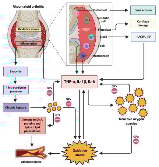 Selenium to promote the resolution of inflammation in rheumatoid arthritis. There is a multidirectional intercommunication between the mechanisms involved in RA. Activation of immune cells in synovial tissue leads to the production of proinflammatory cytokines that have the ability to induce ROS generation. ROS activate NF-κB through phosphorylation of IκB-α or through NIK, generating proinflammatory cytokines that positively feedback the presence of ROS in the joints and lead to the translocation of NF-κB in the other immune cells infiltrated in synovial tissue. Joint pressure generates chronic hypoxia that together with the inflammatory environment causes oxidative stress. Selenoenzyme GPx can reduce inflammation through decreasing one of the most produced ROS (H2O2) and through the inhibition of IκB-α phosphorylation. The constant lipid peroxidation caused by ROS leads to the formation of atheroma plaques. Atherosclerosis is a feature of chronic inflammation in RA. ACPA, autoantibodies against citrullinated peptides; RF, rheumatoid factor; GPx, glutathione peroxidase.