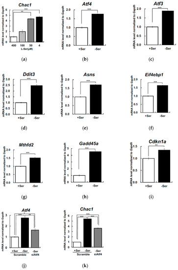 Extracellular L-Ser depletion induces cation transport regulator-like protein 1 (Chac1) and Atf4-target genes mRNA level in Hepa1-6.Hepa1-6 were cultured for 6 h in L-Ser-depleted (4 μM) or -supplemented (50, 100, 400 μM) Eagle’s Minimal Essential Medium (EMEM), and Chac1 (a) mRNA levels were measured. Dunnett’s post hoc test, ** p < 0.005, *** p < 0.0005. Hepa1-6 were cultured under the L-Ser-depleted or -supplemented condition for 6 h, and Atf4, Atf3, Ddit3 (b–d), and Atf4 targeted genes Asns, Eif4ebp1, Mthfd2, Gadd45a and Cdkn1a (e–i) mRNA were measured. Student’s t-test, ** p < 0.005, *** p < 0.0005. Hepa1-6 were cultured under the L-Ser-depleted or -supplemented condition for 6 h, and non-targeting siRNA and siAtf4 were transfected for 24 h, and Atf4 and Chac1 (j,k) mRNA were measured. Tukey’s test, * p < 0.05, ** p < 0.005, *** p < 0.0005.