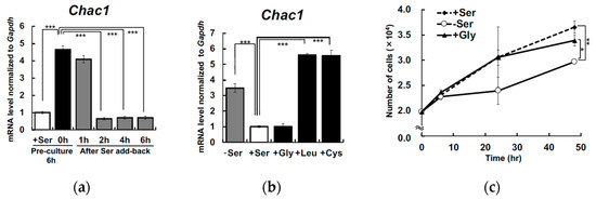 We previously demonstrated that extracellular Ser deficiency led to cell growth arrest and cell death via phosphorylation of p38 MAPK, which was activated by an accumulation of 1-deoxy-sphinganine (doxSA) to reduce Ser availability in Phgdh-deficient mouse embryonic fibroblast (KO-MEFs) [6,7]. Moreover, Ser depletion drove the integrated stress response (ISR) pathway and altered gene expression profiles in KO-MEFs [8], and enhanced vulnerability to oxidative stress resulting in inflammation [9]. Our microarray results demonstrated that intracellular Ser deficiency induced the transcriptional activation of Atf4-target genes including cation transport regulator-like protein 1 (Chac1) in KO-MEFs [8]. These studies shed light on the cellular responses resulting from Ser depletion in non-malignant normal cells. However, whether reduced availability of extracellular Ser elicits such alterations of gene expression in Phgdh-expressing cells remains unknown.