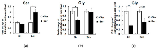 Extracellular L-Ser depletion alters the intracellular and extracellular Ser and Gly level in Hepa1-6. Hepa1-6 were cultured for 6 h and 24 h under the L-Ser-depleted or -supplemented condition, and concentration of intracellular L-Ser (a), intracellular Gly (b), and extracellular Gly (c) were measured. Student’s t-test, * p < 0.05, ** p < 0.005.