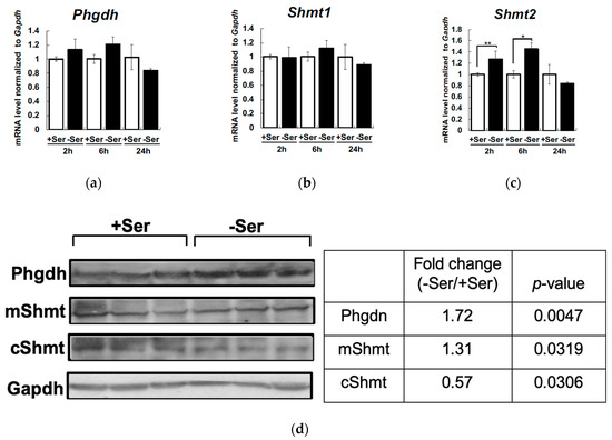 We then analyzed intracellular and extracellular amino acid concentrations of Hepa1-6 cells under Ser-supplemented or -depleted condition for 6 h and 24 h. Intracellular Ser was not decreased in Ser-depleted condition for 6 h, but increased up to 2-fold at 24 h (Figure 4a). In contrast, intracellular Gly was decreased in Ser-depleted condition for 6 h, but recovered at 24 h (Figure 4b). In parallel with these changes, the level of extracellular Gly was significantly decreased at 6 h and 24 h under Ser-depleted conditions (Figure 4c). These observations led us to determine whether the activation of endogenous Ser synthesis from Gly is mediated by Shmt or de novo under Ser depletion. The isozymes Shmt1 and 2 are localized in cytosol and mitochondria, respectively. We then quantified mRNA levels of Shmt1, Shmt2, and Phgdh in Hepa1-6. Phgdh and Shmt1 expression was not induced 2 h and 6 h after Ser depletion (Figure 5a,b), whereas Shmt2 expression was significantly elevated under Ser depletion (Figure 5c). Phgdh and Shmt2 (mShmt) protein expression was significantly increased in Hepa1-6 in Ser-depleted condition for 6 h, whereas the protein level of Shmt1 (cShmt) was not significantly affected under Ser-depleted conditions (Figure 5d).