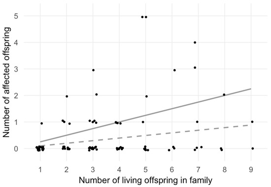To determine if the distribution of expected cases differed from that of the observed cases, the χ2-test was performed (Table 3), which led to the rejection of the null hypothesis of a random distribution (p = 0.006). The outcome of the χ2-test statistics was substantially driven by the two five-membered families with five affected siblings (topmost two points in Figure 1).