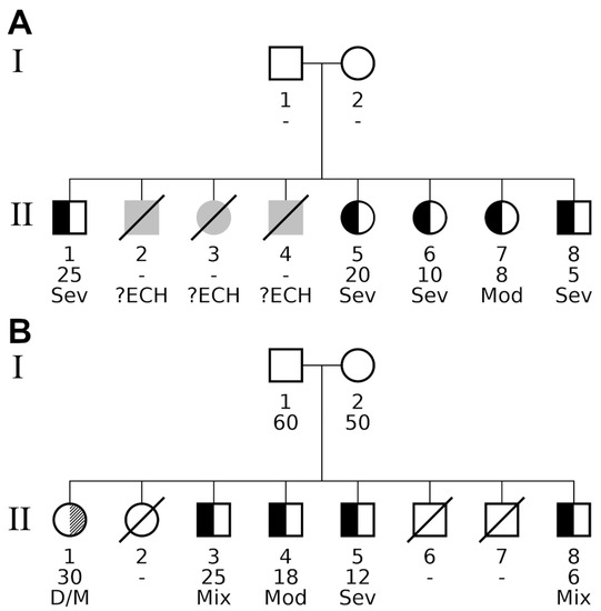 Pedigrees of nuclear families detected by various familial aggregation methods. The pedigrees contained two types of diseases, indicated by split family member symbols. Black fillings in the left half of a subject’s symbol indicate individuals affected by the myxedematous phenotype. A diagonally hatched right-hand segment designates individuals exhibiting the neurological phenotype. Unaffected individuals have a white (i.e., empty) segment encoding the respective phenotype. Additional information is given below a pedigree symbol. 1st line: participant identifier (unique for each generation); 2nd line: age at study participation, unknown age is specified by a hyphen (“-“). Offspring are ordered from left to right by decreasing age; 3rd line: detailed description of the phenotype as follows: Sev (severe) or Mod (moderate) form of persistent myxedema; ?ECH, undefined phenotype of CH; D/M, deaf/mute; Mix, mixed form of myxedematous and neurological phenotype. Both families had healthy parents. (A) Significant myxedematous phenotype aggregation within family A. All living offspring showed signs of myxedema, and even diseased individuals II.2, II.3, and II.4 were reported by villagers to have had suffered from some form of endemic CH (indicated by grey symbols). The late subjects were born between individuals II.1 and II.5, and would have had an age between 20 and 25 years at the date of survey. Overall, family A consisted of eight affected offspring, five alive and three deceased, all of them affected by endemic CH. (B) Significant neurological and myxedematous aggregation in family B. In this family, individual II.1 exposed the neurological phenotype, so when investigating the combined phenotype for familial aggregation, family B had exactly the same number of affected alive offspring and was reported with the same p-values by all three family-based tests. Looking at the myxedematous phenotype only revealed the major difference compared with family A: four affected individuals (II.3, II.4, II.5 and II.8) gave rise to a borderline significant result for tests Binom. Prob. and Kinship Sum (padj = 0.05 in both tests).