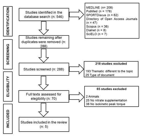 The present systematic review and meta-analysis followed the Preferred Reporting Items for Systematic Reviews and Meta-Analysis (PRISMA) guidelines [41] and the PICOS (population, intervention, comparison, outcome, setting) criteria [42] and was conducted using Dialnet, Directory of Open Access Journals, MEDLINE, PubMed, SciELO, Scopus, and SPORTDiscus databases, including all results published before April 2020. The search strategy terms used were as follows: (nitrate OR beet*) AND (supplement* OR nutr* OR diet*) AND (isokinetic OR strength OR “resistance exercise” OR “resistance training” OR “muscular power”). To our knowledge, this is the first systematic review on this topic, and therefore the search did not include limitations of publication date or language. The original search yielded a total of 546 results. After the elimination of duplicates and screening of inclusion criteria, a total of 70 full-text articles were identified and reviewed by three authors (J.J.R.-Á., F.M.T., P.J.). A quality assessment was performed by two authors (J.J.R.-Á., F.M.T.) according to the PEDro scale [43]. A total of five articles met the eligibility criteria for the present systematic review and meta-analysis (Figure 1).