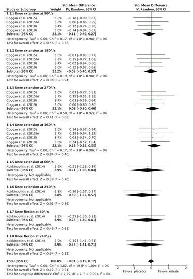 There was a trivial effect size of −0.01 (CI: −0.19, 0.17; I2: 0%; p = 1.00; Figure 2) for the effect of NO3− supplementation on isokinetic torque production when data from all angular velocities were combined. Subgroup analysis on the effect of NO3− supplementation on knee extension isokinetic torque production at 60°/s, 90°/s, 180°/s, 240°/s, 270°/s, and 360°/s revealed that there was a trivial effect size of 0.01 (CI: −0.18, 0.19; I2: 0%; p = 1.00). Independent analysis for each angular velocity revealed trivial effect sizes (ESs) for the effect of NO3− supplementation on knee extension isokinetic torque production at 90°/s (ES: −0.11, CI: −0.49, 0.27; I2: 0%; p = 0.98), 180°/s (ES: −0.02, CI: −0.40, 0.37; I2: 0%; p = 0.98), 270°/s (ES: 0.08, CI: −0.30, 0.46; I2: 0%; p = 0.92), and 360°/s (ES: 0.16, CI: −0.22, 0.5; I2: 0%; p = 0.98).