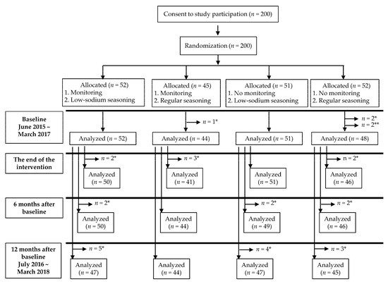 A randomized controlled trial was performed using a 2 × 2 factorial design with two interventions: home seasoning monitoring (monitoring) and using low-sodium seasoning (seasoning). We recruited 29–51 participants in each of five different time periods between June of 2015 and March of 2017. Participants who provided consent to be included in this study were allocated into the following four groups within each time period: (1) monitoring salt concentrations and using low-sodium seasoning, (2) monitoring salt concentrations and using regular seasoning, (3) not monitoring salt concentrations and using low-sodium seasoning, and (4) not monitoring salt concentrations and using regular seasoning. Family members of the same household were assigned to the same group. Therefore, with regard to monitoring intervention, the intervention group consisted of groups (1) and (2) and the control group consisted of groups (3) and (4). Similarly, for seasoning intervention, the intervention group consisted of groups (1) and (3) and the control group consisted of groups (2) and (4) (Figure 1). Three participants who missed urine collection ≥2 times during the 24-hour collection at baseline and two users of hypertensive medicine discovered during the baseline survey were excluded. Furthermore, participants who missed urine collection during follow-up surveys were excluded from the analysis of comparison to baseline (Figure 1). The random allocations were carried out independently by a research coordinator. The study was double-blinded so that neither the participants nor evaluators of outcomes knew the allocation of intervention during the intervention, evaluation, and analysis. In addition, regardless of group allocation, all participants were provided information on reducing salt intake at the start of the intervention through the distribution of a clear folder printed with tips on reducing salt intake and the amount of salt in some salty foods [19].