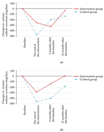 With regard to seasoning intervention, at the end of the three-month intervention, the reduction of urinary sodium excretion in terms of crude mean value in the intervention group was smaller than that in the control group without statistical significance (−287 and −463 mg/day for intervention and control groups, respectively; p = 0.47). The results were adjusted for sex, alcohol drinking, medication status, residential areas, other interventions, urinary sodium excretion level at baseline, and interaction term. The reduction of urinary sodium excretion in the intervention group was greater compared to that in control group although it was not statistically significant (−297 and −173 mg/day for intervention and control groups, respectively; p = 0.52). Changes from baseline decreased in the six- and twelve-month follow-up surveys in both intervention and control groups, with corresponding values of −139 and 6 mg/day in the intervention group, respectively, and −398 and −184 mg/day in the control group, respectively. Although the mean values of urinary sodium excretion decreased after the intervention period in both groups, they returned to baseline level in the long-term follow-up period (Figure 2b).