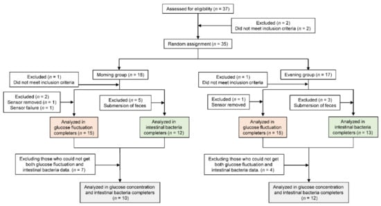 During the baseline period, the participant’s physical characteristics were measured, and participants filled out a lifestyle survey (e.g., mealtime, chronotype) and a food frequency survey. During the two-week experiment period, all subjects were asked to evaluate their physical activity level with a triaxial accelerometer, and to wear a continuous glucose monitoring system. They were also asked to collect their feces in a tube with phosphate-buffered saline containing 20% glycerol, which had been distributed in advance, before and after the intervention period for intestinal microbiota evaluation (mornings of Day 8 and 15). Collected fecal samples were transported to the laboratory at 4 °C and were then immediately frozen in liquid nitrogen and stored at −80 °C until analysis.