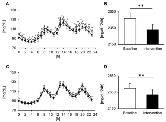 Diurnal changes in the blood glucose levels and area under the curve (AUC) across the day in the morning ((A,B), n = 15) and evening groups ((C,D), n = 15). Values are expressed as means and standard errors. # p < 0.05, ## p < 0.01 compared to the baseline level (Bonferroni correction was used for post-hoc comparisons), ** p < 0.01 compared to the baseline level (paired t-test).