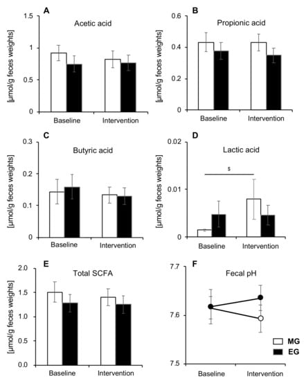 Changes in SCFA and pH before and after intervention in both groups (n = 22). (A) acetic acid, (B) propionic acid, (C) butyric acid, (D) lactic acid, (E) total SCFA, and (F) fecal pH. Values are expressed as means and standard errors. $ p < 0.05 compared to baseline levels (Wilcoxon). SCFA: short-chain fatty acid, MG: morning group, EG: evening group.