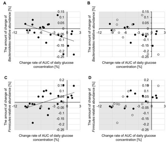 In order to evaluate how the intestinal microbiota changed in people whose glucose level changed, we calculated the correlation between the change rate of the AUC of the daily glucose level and the amount of change in the intestinal microbiota relative abundance. Analysis of intestinal microbiota was carried out for 22 participants for whom we were able to collect both glucose level and fecal data. In this study, we focused on the Bacteroidetes and Firmicutes phyla, which are beneficial bacteria that are predominately found in the human gut. For the 22 participants, we found that the change rates of the AUC of the daily glucose level were negatively correlated with the relative abundance of phylum Bacteroidetes (r = −0.525, p = 0.012), and positively correlated with that of phylum Firmicutes (r = 0.539, p = 0.010) (Figure 6A,C). Comparing each group, the change rate of the AUC of the daily glucose level tended to be negatively correlated with the relative abundance of phylum Bacteroidetes (morning: r = −0.583, p = 0.077, evening: r = −0.530, p = 0.076) and positively correlated with that of phylum Firmicutes (morning: r = 0.603, p = 0.065, evening: r = 0.519, p = 0.084) (Figure 6B,D).