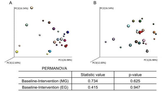 We also analyzed the PCoA of the weighted UniFrac distances and assessed the beta-diversity of the microbiota composition (Figure 7). However, there were no significant changes in the beta-diversity of the microbiota before and after the intervention in either group.