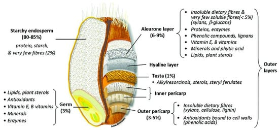 Wheat, barley, oats and rye belong, as all true cereals do per definition, to the grass family (Poaceae). This family is a very diverse family, covering plants that humans have used to grow a lawn to plants that can grow several meters tall (bamboo) [13]. Cereal grains have a complex structure that is characterized by different cell layers. Although the individual structural parts of the different cereal kernels may differ significantly in terms of composition and size, the general cereal structure remains largely the same [8]. Three main parts can be distinguished: the embryo or germ, the endosperm, and the outer kernel layers that cover the embryo and endosperm or the so-called bran [14]. The starchy endosperm accounts for 80–85% of the grain. It is mainly composed of starch and protein. Bran and germ represent 12–18% and 2–3% of the dry grain weight, respectively [15]. The embryo is vital for the germination process, as it comprises the embryonic axis and scutellum. The embryo has the highest content of lipids and lipid-soluble vitamins of all fractions in the cereal kernel [16]. The endosperm has the highest economic importance. In the endosperm insoluble nutrients, mainly starch and proteins, are deposited as an energy source for the developing plant upon germination [15]. The aleurone layer is the outermost layer of the endosperm. It usually consists of 1 to 3 layers of cells, depending on the cereal. In some cases, pigmentation in the aleurone layer can give cereal kernels a distinct colour [16]. Although botanically, the aleurone layer is considered to be part of the endosperm, a major part of this layer has been shown to be removed during roller milling and, hence, is often not part of the refined white cereal flour [17]. The bran fraction consists of several different layers that can be distinguished from one another, i.e., outer pericarp, inner pericarp, testa, and nucellar epidermis (also called hyaline layer) (Figure 1) [15]. Inner and outer pericarp are rich in highly crosslinked polysaccharides, such as cellulose, lignin and heteroxylan [18,19]. The testa of barley, oats and rice is present as one cell layer, while wheat and rye testas generally have two distinct layers [14]. The nucellar epidermis is the maternal tissue that covers the endosperm, but is not prominent in all cereals [16]. In sorghum, this layer is very prominently present, but it is usually absent or only present as a thin layer in most other cereals [20].