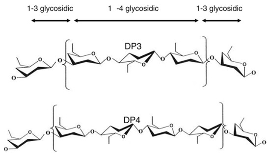 Barley is one of the earliest cultivated cereals and exists in hulled and hulless varieties. Hulled barley can be dehulled after harvest prior to processing [7]. However, the hull from barley is not that easy to remove, as it is ‘cemented’ to the outer layer of the kernel or caryopsis, i.e., the pericarp [43]. In both hulled and hulless types, the caryopsis is composed of the pericarp, testa (seed coat), aleurone layer, endosperm, and embryo [7]. Oats, on the other hand, is also a hulled cereal, but its hull is relatively easy to remove. Barley and oats are an excellent source of soluble and insoluble dietary fibre and other bioactive compounds. Soluble dietary fibre (mainly β-glucan) is located in the endosperm cell walls, while the (predominantly) insoluble dietary fibre fraction (cellulose, AX and lignin) is mainly found in the cereal bran [66]. The total dietary fibre content of dehulled barley and oats ranges from 10 to 28% [43,44] and 10 to 38% [23,41,42] (on dry matter basis), respectively (Table 1). Both barley and oats contain β-glucan as the primary non-starch polysaccharide in the whole kernel. AX is also found in both cereals, but in a much lesser content. β-glucan and AX are typically present as 70 to 20% of the total dietary fibre content in these cereals. Cereal β-glucan is composed of cellotriosyl and cellotetraosyl units linked through β-1-3 linkages (Figure 3) [7]. The presence of such β-1-3 linkages leads to bends in the polymer chain structure, allowing water to get in between the chains [7]. This explains the higher solubility of β-glucan as compared to cellulose, a structurally related polymer built exclusively of β-1-4-linked d-glucose units [67].